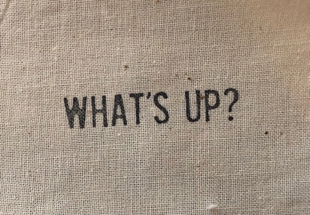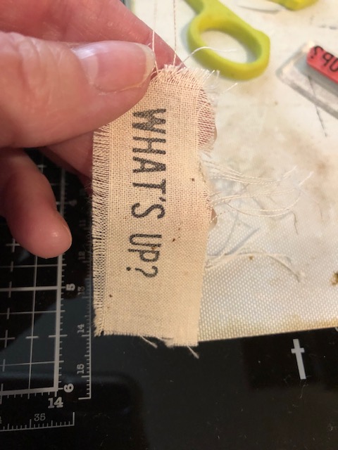 7. Stamp “Whats up?” onto a scrap piece of muslin using Versafine ink. Fray the edges by pulling threads evenly around the piece. Attach it to the lower right with foam dots and finish with a tiny clip attached and glued to the upper left of the muslin.