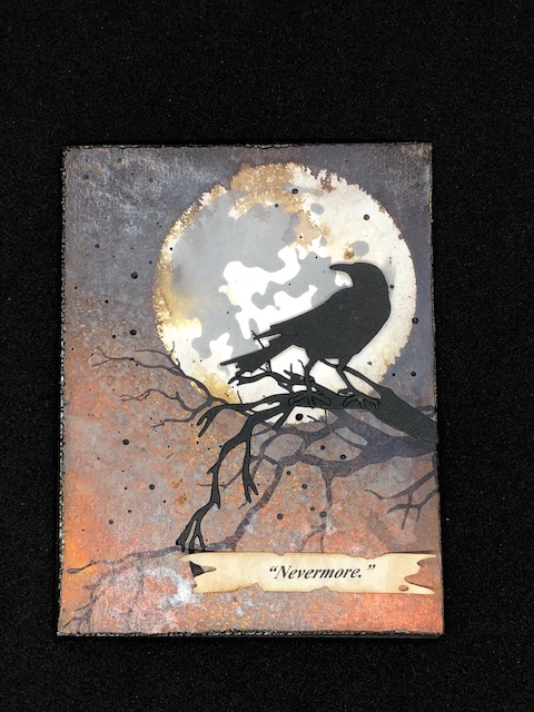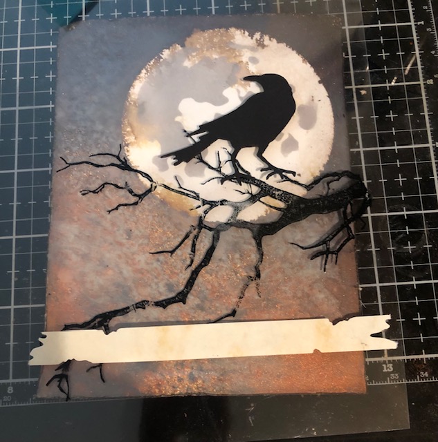 7. I distressed the edges of the banner with Vintage Photo and attached it under my raven. Lastly I distressed all the edges of the card and inked them in Black Soot and attached the whole thing to a black card base.