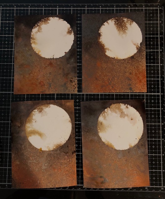 2. Once that part was dry, I laid down the second step of the mask with a removable adhesive dot and inked the stencil areas with hickory smoke oxide. After I removed this mask I went over the edge of the moon a bit with the hickory smoke.