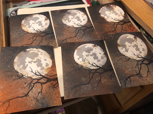 - I made my background on watercolor paper. I stuck the medium circle from the moon mask down with removable sticky dots and started spraying, starting with the brushed corduroy spray, then the ground espresso, then finally the two mica sprays. I added, sprayed and dribbled with water, drying and dabbing in between water splatters until it looked how I wanted. Each one came out slightly different which is part of the fun =). Once I had finished spraying/drying, I removed the mask and spritzed the moon area to make the ink drift into the moon a little bit.