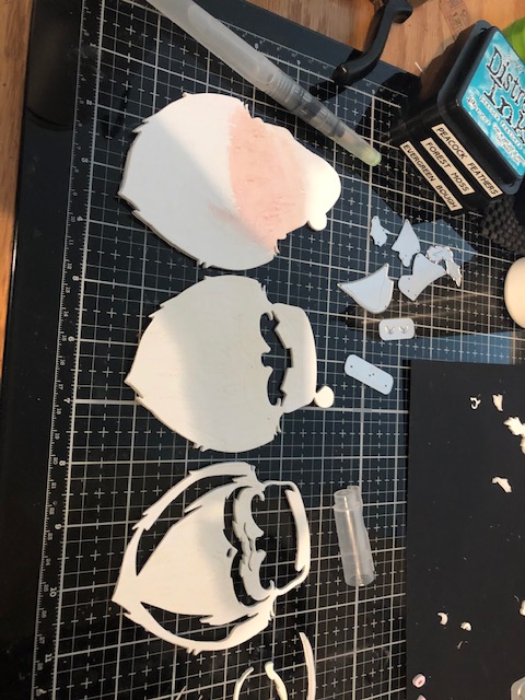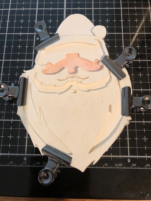 2. Layer each paper piece to it’s corresponding white foam piece and attach. NOTE: Do not layer your paper nose circle piece to a piece of foam. It looked too weird sticking out so far, so that is the ONLY piece that is not layered onto a foam piece. Then start assembling your Santa following the Sizzix video as needed. I held my Santa together with hinge clips while it dried.