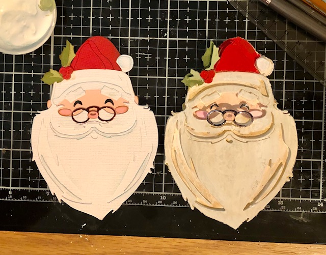 3. Once it was dry, I filled in the edge of my Santa with textured grit paste (you could also use regulare texture paste, I just happened to be out of it at the time…lol). Then, using acrylic paints, I painted him to get nice bright colors. Then to “antique” him and bring out the wood grain, I brushed over him using watered down Vintage Photo Ink and a small paint brush. Note the little pink nose is not popped up with foam…trust me, it looked weird with foam…lol