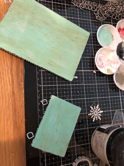 5. Instead the front became the side where I adhered a baseboard and a piece of ephemera. (Nothing ever ends up how you originally plan lol). I distressed this with Vintage photo and then, I coated the panels with a layer of collage medium. Once that was dry I applied a layer of the icicle texture paste. The cracks are very difficult to see in photos but they are there . I also painted one of the scalloped trims green and applied the crackle to this piece as well. On the trim piece, once it was dry I went over it with Black Soot distress crayon to really see the cracking. I inserted eye screws in the small panel first then into the large panel making sure to match up the screws how I wanted to hang them. I trimmed each piece with trim tape for a nice finished edge.