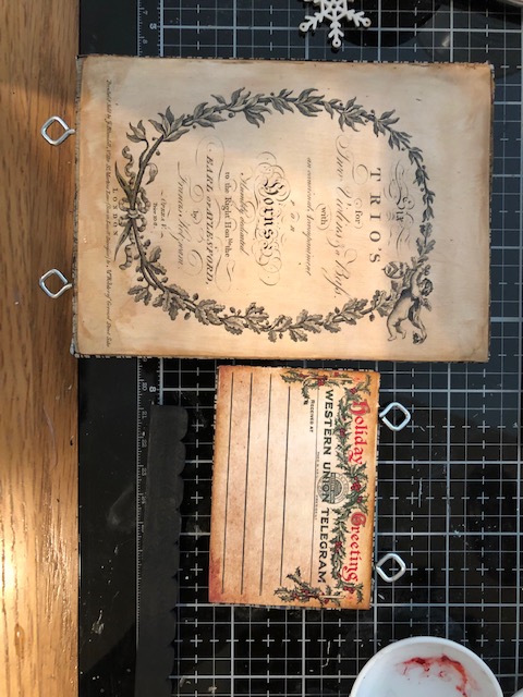 4. I used two of the vignette panels that come in a pack- the 4″ x 5 1/2″ one and the 3 14″ (approx.) x 2 1/16″ one. I painted them pale blue and inked them with watered down vintage photo and finally splattered them with gesso. Originally these were going to be the front….