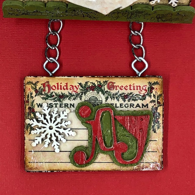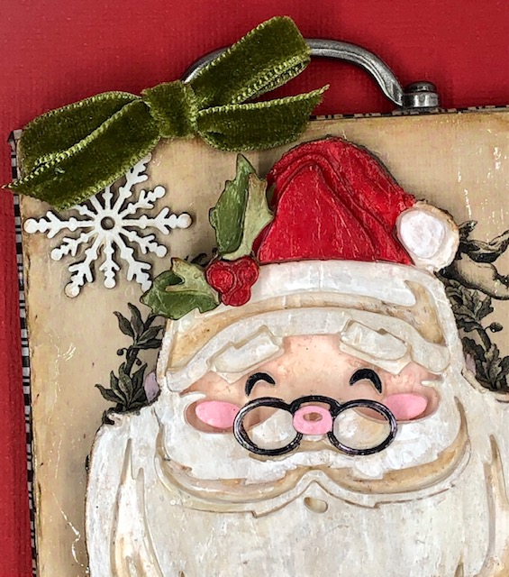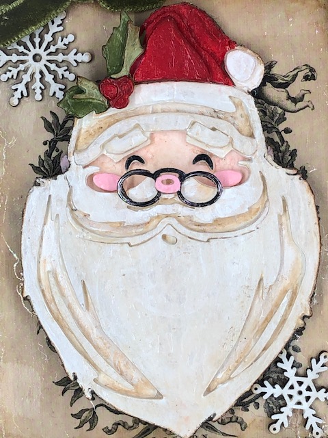 6. I cut out the “JOY” from the festive word set twice- again from embossed watercolor paper and fun foam. I adhered them together, painted them and filled in the side with grit paste using the same method as the Santa. This got attached to the smaller vignette panel. I painted three snowflakes white and adhered them around the Santa and the joy panel. The green trim piece was attached to the bottom of the Santa panel. I then went over the entire project with collage medium to have a nice uniform finish.