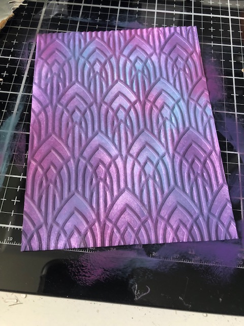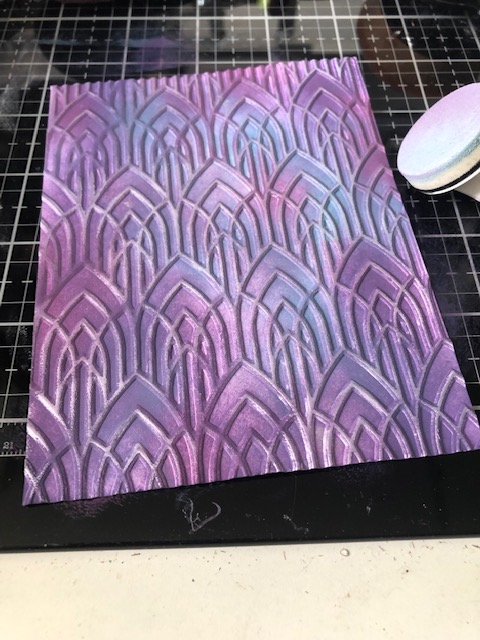 3. Using blending brushes color the embossed piece with the oxides. I had no rhyme or reason as to how I placed the colors, just kind of blended them all around.