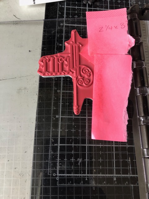 4. Using a flat foam pad on a blending tool, rub the nuvo mousse lightly over the embossed piece, catching the raised portions of the piece. Set aside to dry a bit.