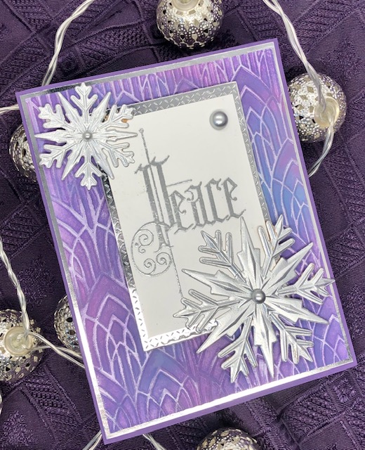 1. Make a 5 1/2″ x 4 1/4″ base with the deep lilac card stock. Set aside. Cut a 5 3/8″ x 4 1/8″ mat from the silver card stock. From the center of this mat cut the 2 1/2″ x 3 3/4″ cross stitch rectangle from the nested set. From another piece of silver card stock cut the snowflake impresslit. If your paper is like mine, with a silver side and a kraft side, I found lightly spraying just the kraft side with water seemed to work best before running it through your machine.
