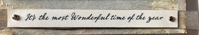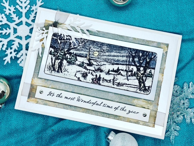 3. Stamp the holiday scene onto mixed media or watercolor paper, masking off the sentiment and stamping it onto a separate piece of paper (5 1/2″ x 5/8″). Fussy cut the the scene and place brads on each end of the sentiment piece. Using a water brush and various distress inks, color the scene. I used a very light touch to just get a touch of color but not over saturate the scene.