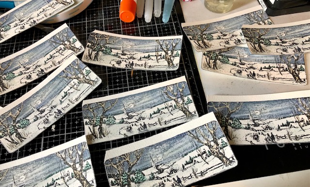 - Tim Holtz/ Ranger distress inks (for coloring scene) in Vintage Photo, Antique Linen, Scattered Straw, Evergreen Bough, Victorian Velvet, Festive Berries, Pumice Stone, Chipped Sapphire