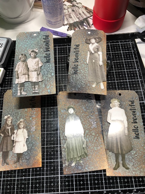 - I sprayed all the tags with the four colors listed above. I let them dry, splattered with water and let them dry again. (I am not sure how I forgot to take a picture of this step, but somehow I did). After they were dry, I chose ten paper dolls, decided where they would be on each tag, then stamped a sentiment (either ” I am who I am ” or “hello beautiful”) in versafine clair ink, then heat embossed with clear embossing powder.