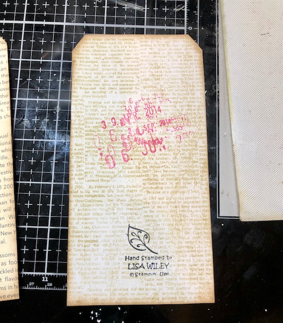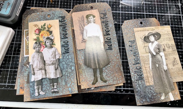 4. Once I was happy with each tag, I attached all the pieces down and trimmed any excess. NOTE: I inked the edges of everything with gathered twigs ink before attaching.