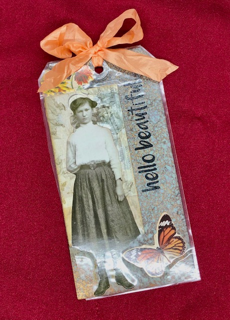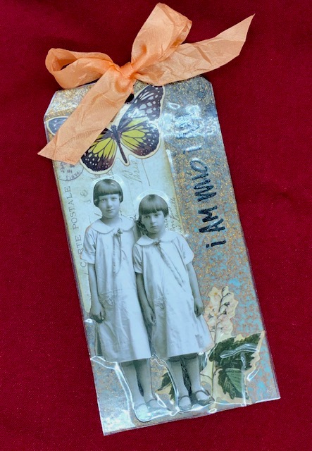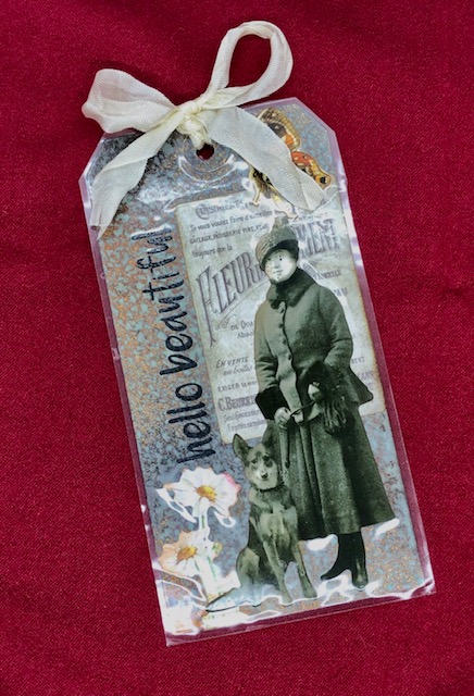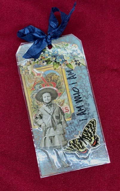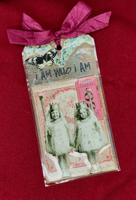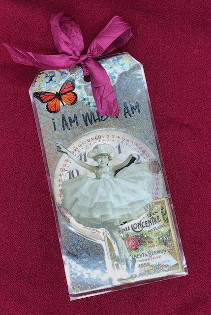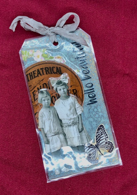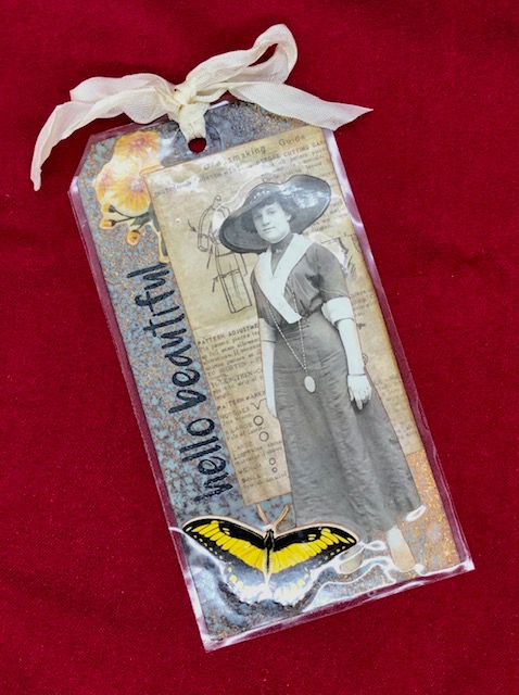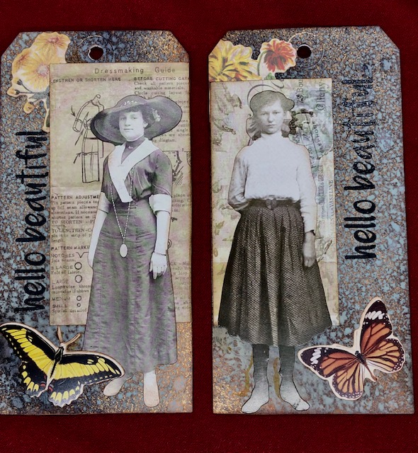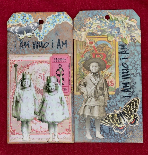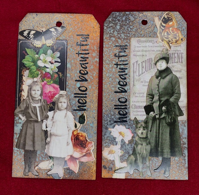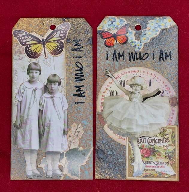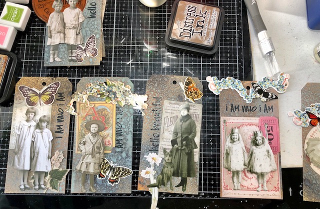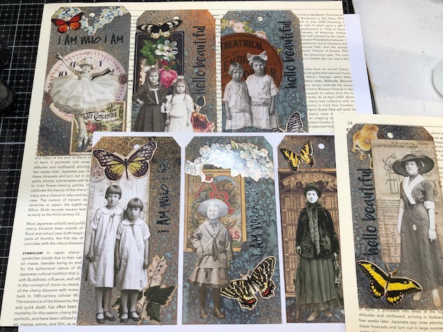 3. I chose two more pieces of ephemera for each tag- one floral and one butterfly. I didn’t worry if the pieces hung over as I planned to trim them to fit.
