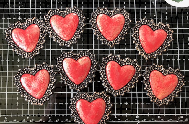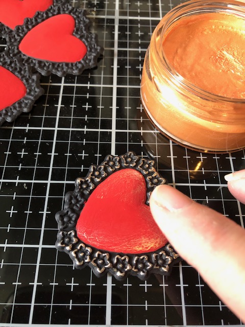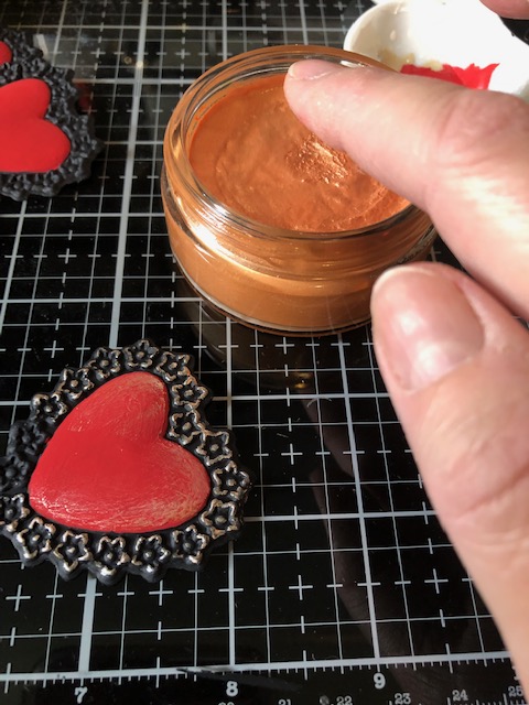 6. Using your finger and apricot gilding polish, lightly rub the polish over the edges of the heart as well as a rubbing a bit over the center heart. Set aside to dry