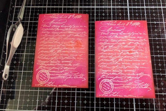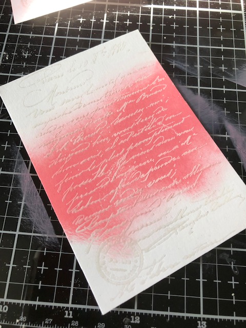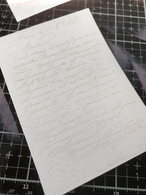- Take the white 4 1/4″ x 3″ piece of card stock and stamp it with clear embossing ink with the script stamp from French Marketplace. Heat emboss the image with clear embossing ink.
