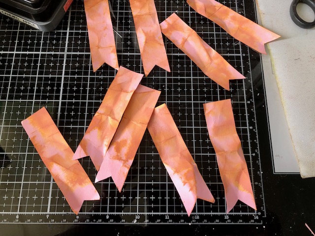 7. Take the strip of pink card stock and banner cut one end. Spray the paper lightly with water and crumple the banner up. Once it has dried lightly rub Rusty Hinge over the surface of the banner and spray again with water. Once dry rub the edges with Vintage Photo Ink.