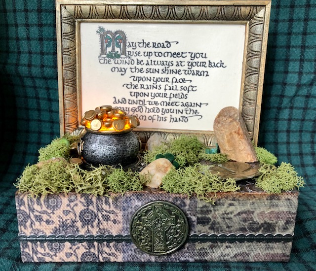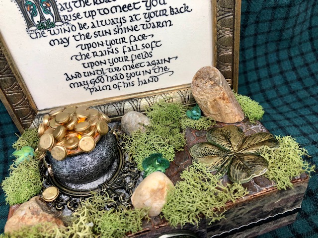 As a final touch, I glued an Irish Blessing coin to the front of the box. This was a coin I bought many years ago. It came in a bag of like 12-15 or so and I had given them out to my family at our St. Patrick’s Day celebration years ago. I still have a few left. The reverse of the coin has this blessing on it: “May your troubles be less, your blessings be more, and nothing but happiness come through your door!”
