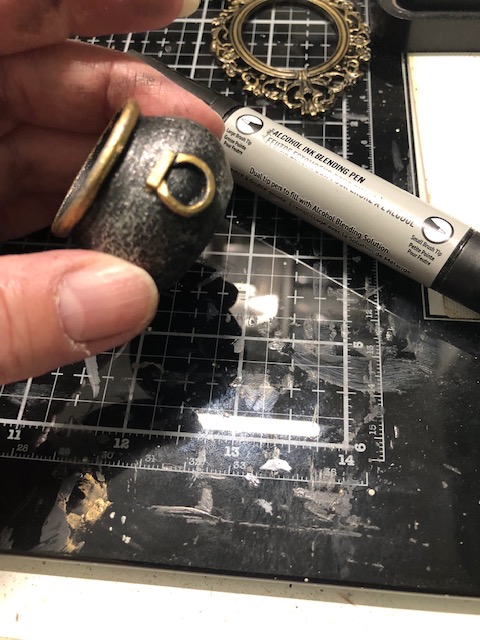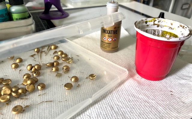 To make the “coins”, I used a decorative filler I found at Michaels that was flat on one side. I colored them using gold alloy alcohol ink, shaking them in a cup until covered, then letting dry.