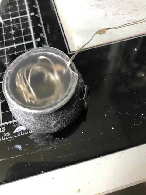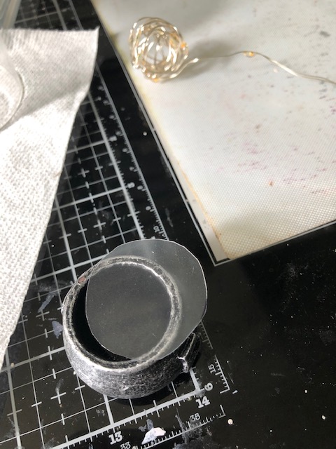 I knew I wanted tiny lights inside the cauldron and I didn’t want coins filling the space so I cut a piece of clear acrylic to fit the top of the cauldron that I could glue the coins to. I cut a notch in this piece to make room for the cord. Then I made a nice stack of coins on top of this piece. I touched up coins using my alcohol pen dipped in gold alloy.