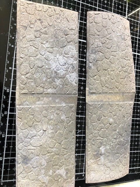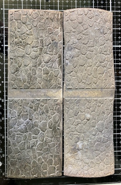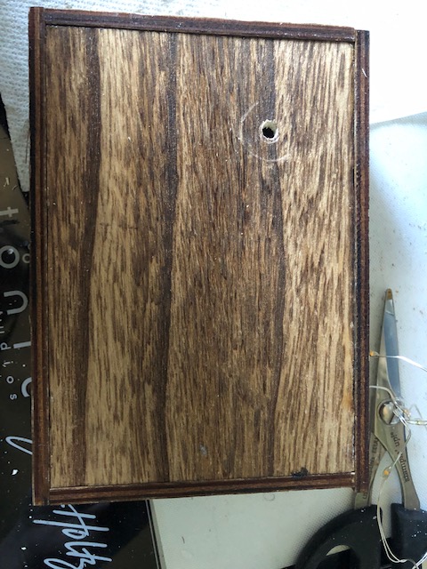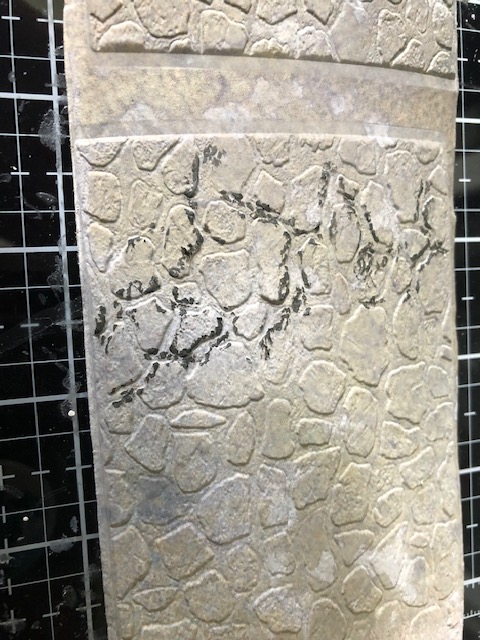 First I worked on the base of the vignette. I used spray stains and oxides to color a piece of watercolor paper, then I embossed it using the cobblestone embossing folder. I went over the spaces in between the cobblestones with Walnut stain distress crayon, and blended it out with my finger. While that was drying, I drilled a small hole in the vignette box where I wanted the cauldron to sit so I could thread tiny lights up to it. Then I glued the cobblestone to the top of the box, trimming the excess. I then poked a hole through the paper using the drilled hole as a guide.