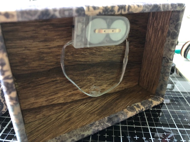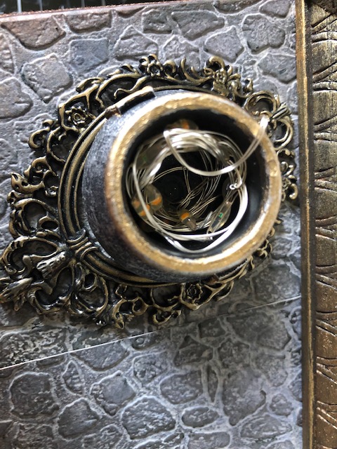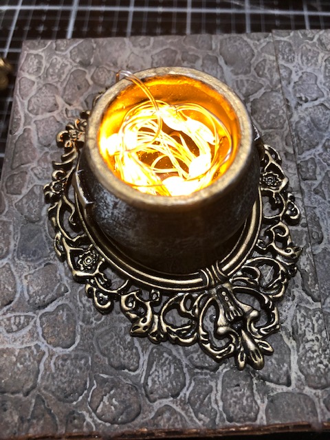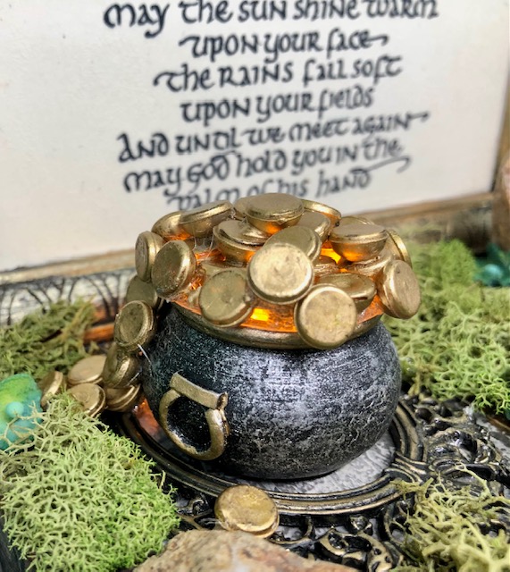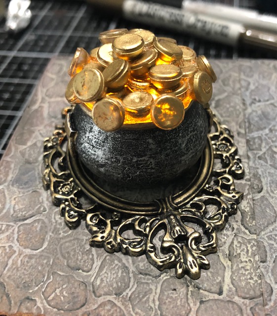 To add some interest to the cauldron, I colored the handles using my alcohol pen and gold alloy. I also ran some over the metal frame that the cauldron sits in. I threaded the tiny lights through the hole in the vignette box, and the frame then coiled them tightly to fit inside the cauldron. I glued the excess cord to the bottom of the box and attached the battery pack to the bottom of the box using a piece of Velcro. I glued the frame and the cauldron to the top of the box. Then I glued the acrylic piece with the coins attached to the top of the cauldron. to finish, I added several more coins dripping out of the cauldron to hide the cord.