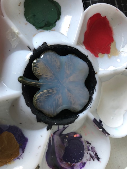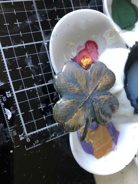 I cut a clover from Lucky Love out of green paper and dry brushed it with Tarnished Brass paint before coating the entire thing with Journey Glaze (similar to crystal effects).