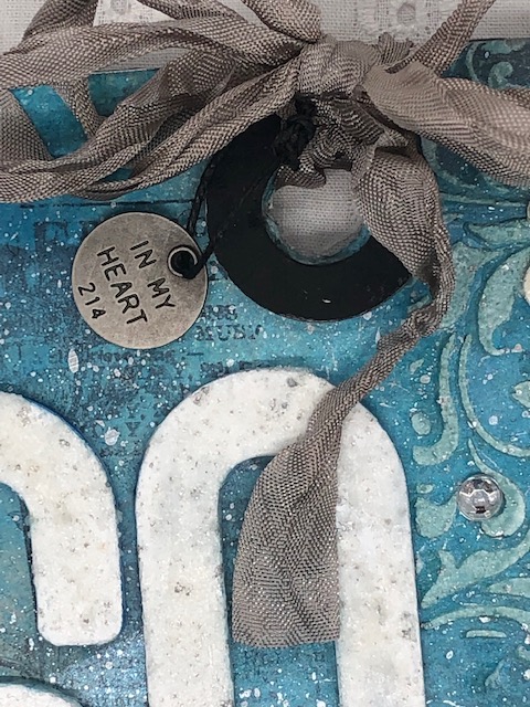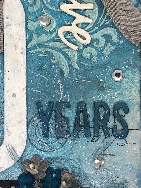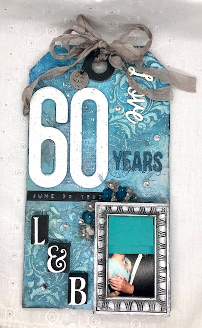 Finally, I painted the tag reinforcer with Black Soot distress paint, added some vintage pewter seam binding ribbon and added a quote token with black twine. I scattered a few crystal drops over the tag representing the “diamond” anniversary. The whole thing was glued to a chipboard etc tag.