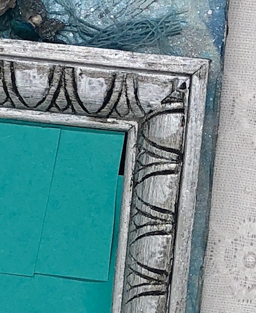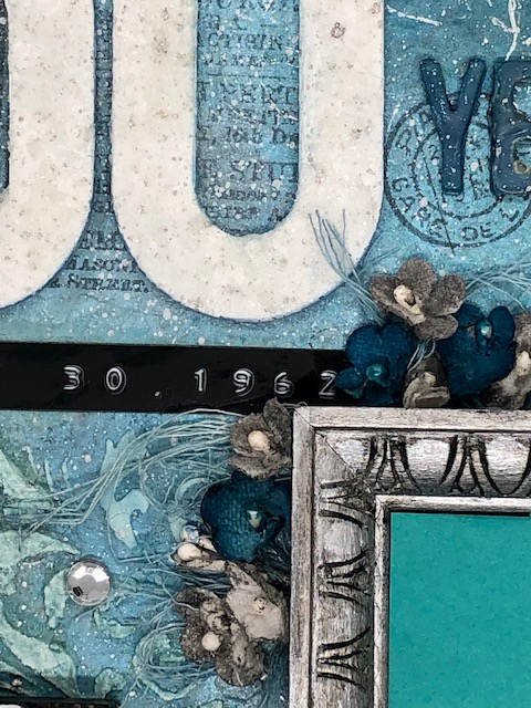I used a friend’s old fashioned label maker to make a label with their wedding date and attached this under the 60. I dyed some mummy cloth (TH94155) with Broken china distress spray, and some flowers from the Idea-ology bouquet (TH93569) with Uncharted Mariner and Brushed pewter to add under the corner of the frame. The frame is the medium one from the vignette frames pack (TH93694). I painted it with Brushed Pewter Distress paint, then went over it with Black Soot distress crayon, wiping away the excess. This size is perfect for a standard wallet size photo.