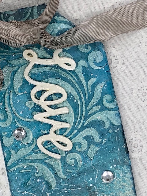 I die cut several “love” sentiments and stacked them, then coated them with glaze (like crystal effects) to make it shiny. This was glued onto the upper right flourish.