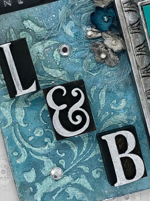 The “L & B” (their initials) are older Tim Holtz Letterpress blocks (TH93130) that I painted with black soot and brushed pewter distress paints. These are glued over the bottom left flourish.