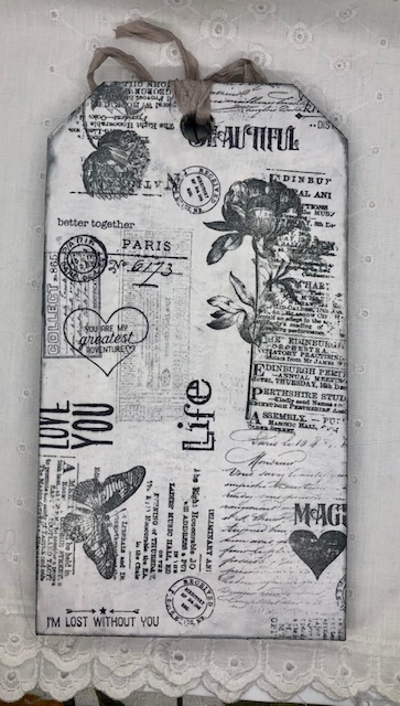 I painted the back of the tag with picket fence distress paint. I stamped several images/parts of images in black archival ink to a piece of blank collage paper that I cut to fit the back of the tag. It was attached and sealed with collage medium. I painted the edge of the tag with Brushed Pewter distress paint, then went over the edges with Black Soot distress ink.