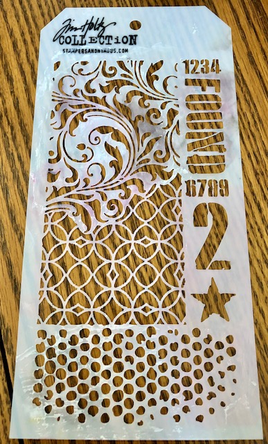 I first traced an etc tag onto a sheet of mixed media card stock. This card stock was my base that, when finished, got glued to the chip board tag. I sprayed it with Uncharted Mariner distress spray stain, Pumice Stone distress oxide spray and distress mica sprays in Snowflurries and Brushed Pewter. Once that was dry I used the flourish area of an old stencil I have to add a textured flourish to the top right and bottom left of the image. This stencil is an older one that I could not find any information on at all, but here is an image of it. I believe the same flourish is part of other stencils in the line as well.