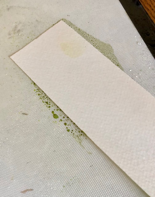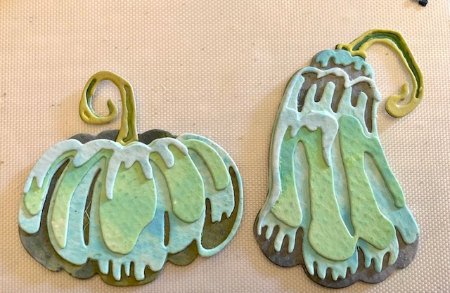 This project all started with the pumpkins. I made both an orange set and a green one, but used just the green ones on this project. First I colored strips of watercolor paper with various distress inks. For each strip, I smooshed the ink on my craft mat, spritzed it with water and dipped the strips in the different colors. I used the colored strips to die cut the various pieces of the pumpkins.