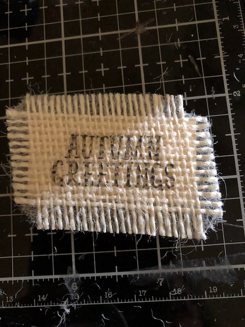 For the greeting, I stamped Autumn Greetings onto a piece of burlap ribbon using Versafine Clair ink in Nocturne. To reinforce this piece I attached a small piece of card stock to the back. I frayed the edges of the burlap by pulling some threads free. This got centered at the top of the card. I added a small staple using my tiny attacher.