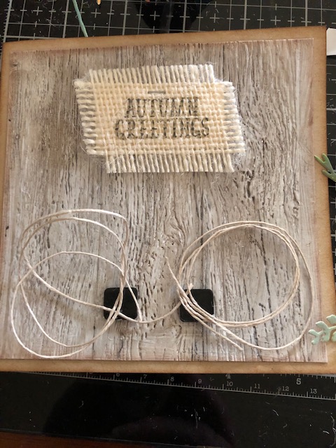 To assemble the card, I first put some foam squares down and wound two pieces of twine around my hand and stuck them down on the foam squares.