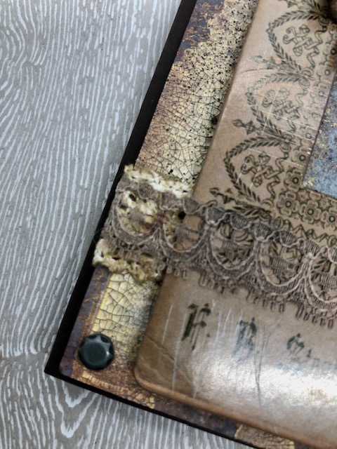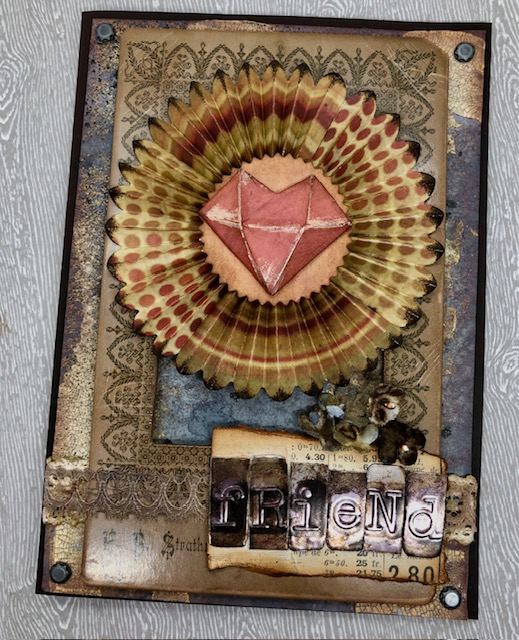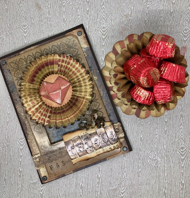I used sprays on mixed media card stock to make the background. I used the crackle paste randomly over the paper to add some interest. I scuffed up the baseboard frame with a nail file and inked it with vintage photo. I finished the corners with hardware heads, added lace and bouquet flowers that I had colored with sprays. I dabbed the completed rosette with embossing ink so I could add the scorched timber glaze around the edge. After I assembled the heart I rubbed it with the cosmic shimmer gilding polish to add a bit of shine. I also added type chips spelling out “friend”. I had a lot of fun making this card and decided to add a little candy dish I made with rosettes and filled with my friend’s favorite candy.
