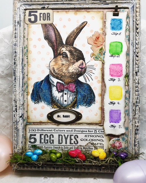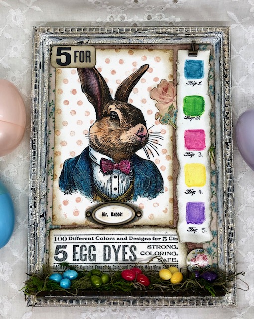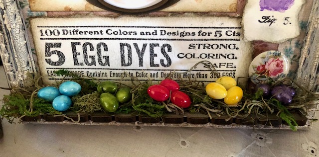 I dyed the tiny resin eggs using alcohol inks in Tranquil (pearl), Gumball, Lemonade, Lettuce and Amethyst (note: the lettuce and Amethyst have the old packaging without the name so those are educated guesses ). They were glued on a bed of moss to a piece of decorative trim I had covered by cutting another piece of worn wallpaper cut using the decorative trims dies. This was glued to the bottom of the framed panel.