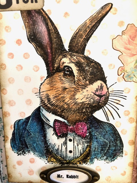 I stamped Mr. Rabbit with Versafine Clair ink in Nocturne on watercolor paper, and colored him with distress watercolor pencils and Prismacolor pencils. After I colored him I re-stamped him (I used a stamping platform) just to bring back some of the black details. I used the polka dot stamp in the set to add some Tattered Rose dots. I inked his name with a black marker on a portion of one of the stamps, and stamped it on a scrap piece of paper that I framed in an old frame I had ( I think it is Stamping Up!). I attached this under him.