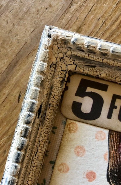 I started with a Tim Holtz framed panel (this size, approx. 6 1/2″x 9″, may be retired). I painted it with Black Soot distress paint, let it dry then coated it heavily with Distress crackle paste in opaque, using a palette knife. Once that was dry, I rubbed it lightly with Vintage Photo distress ink. I love the crackly, distressed look it ended up with. Here is a close-up.